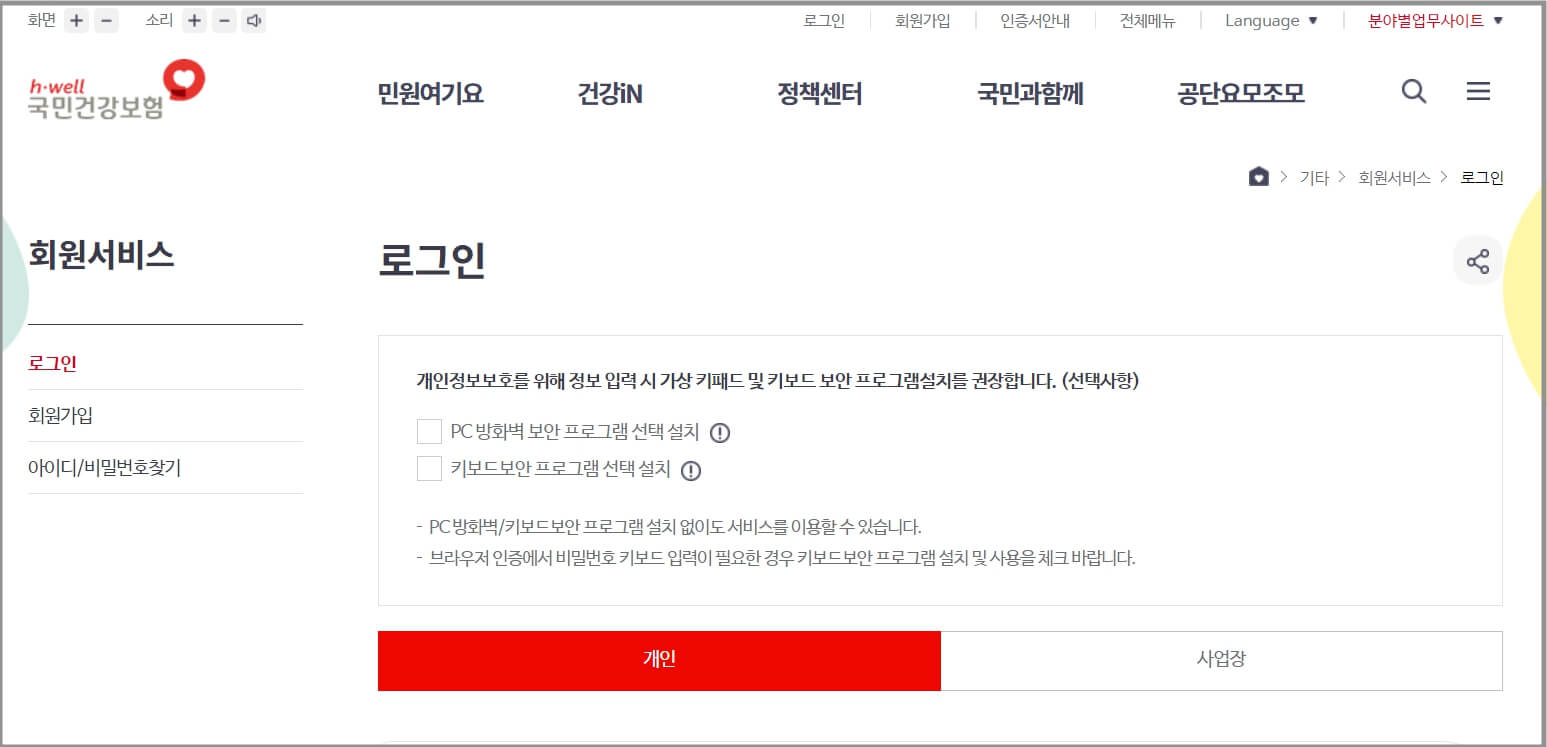 로그인 < 회원서비스 < 기타 | 국민건강보험